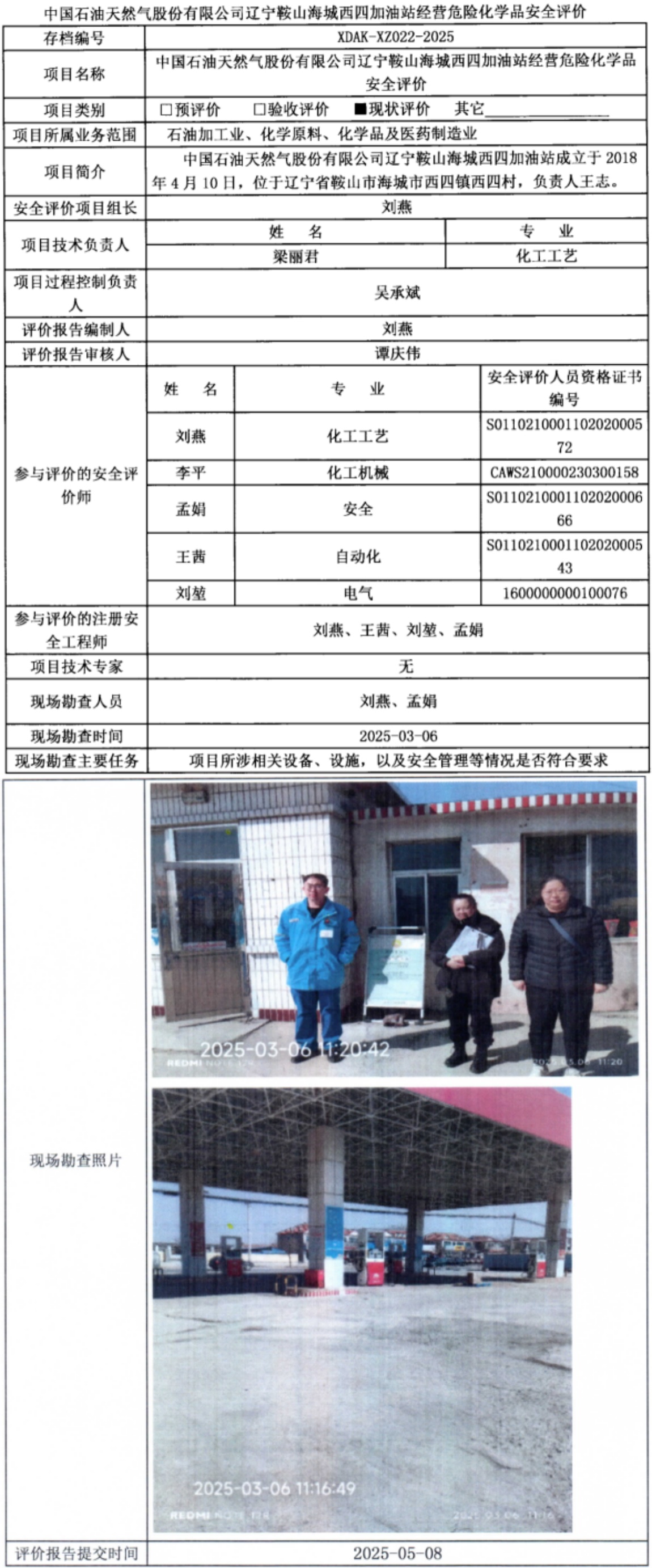 中国石油天然气股份有限公司辽宁鞍山海城西四加油站经营危险化学品安全评价