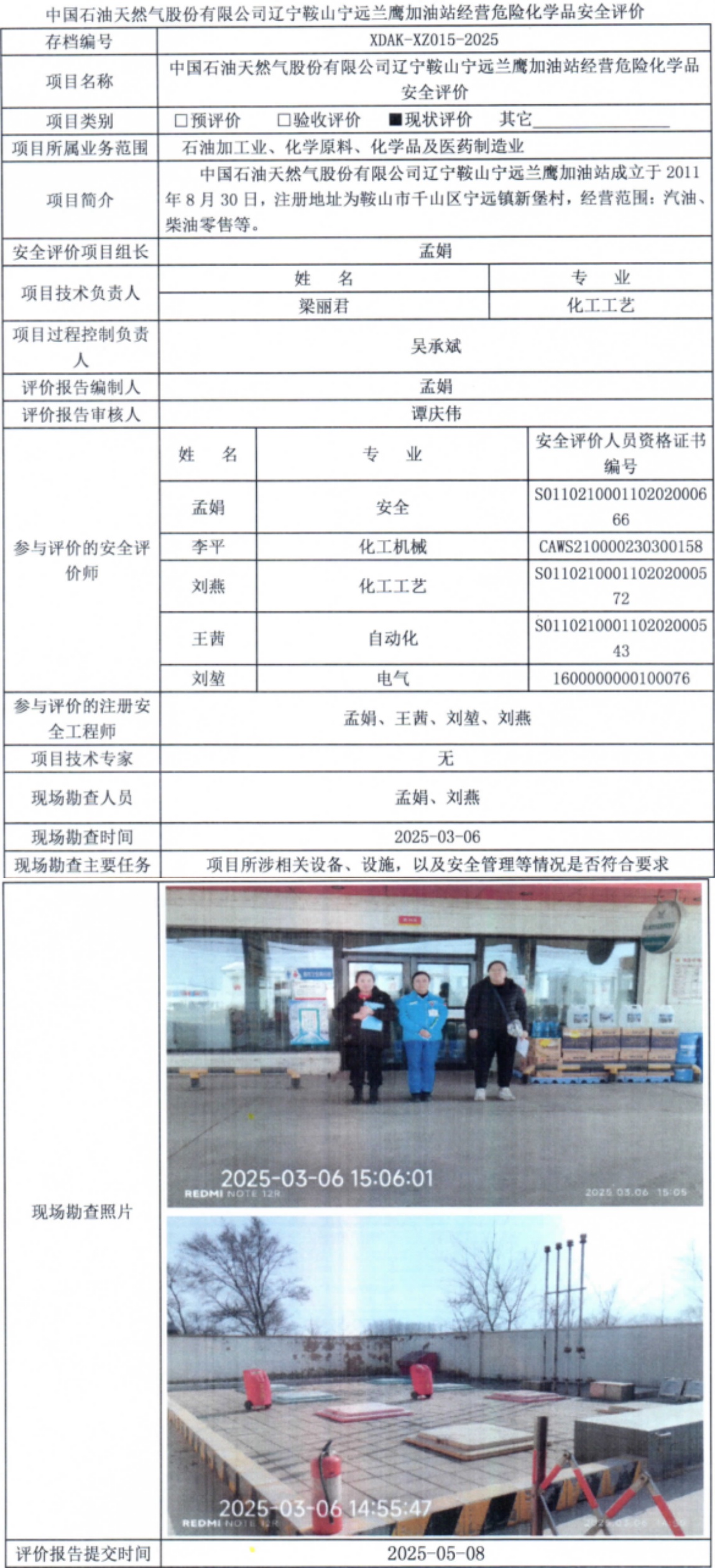 中国石油天然气股份有限公司辽宁鞍山宁远兰鹰加油站经营危险化学品安全评价
