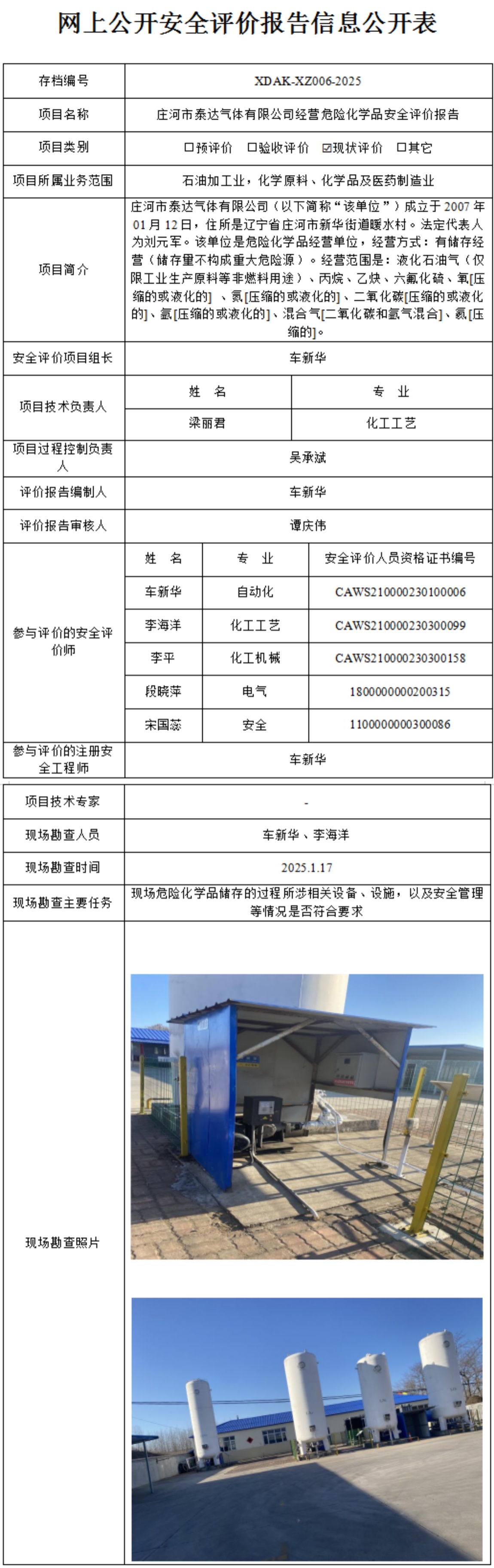 庄河市泰达气体有限公司经营危险化学品安全评价报告