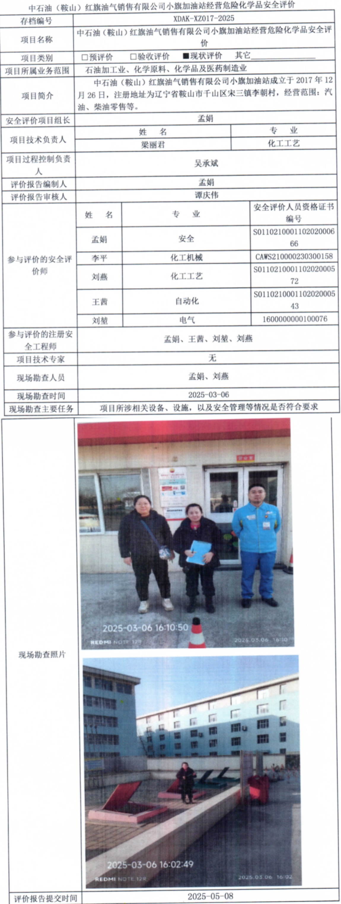 中石油(鞍山)红旗油气销售有限公司小旗加油站经营危险化学品安全评价