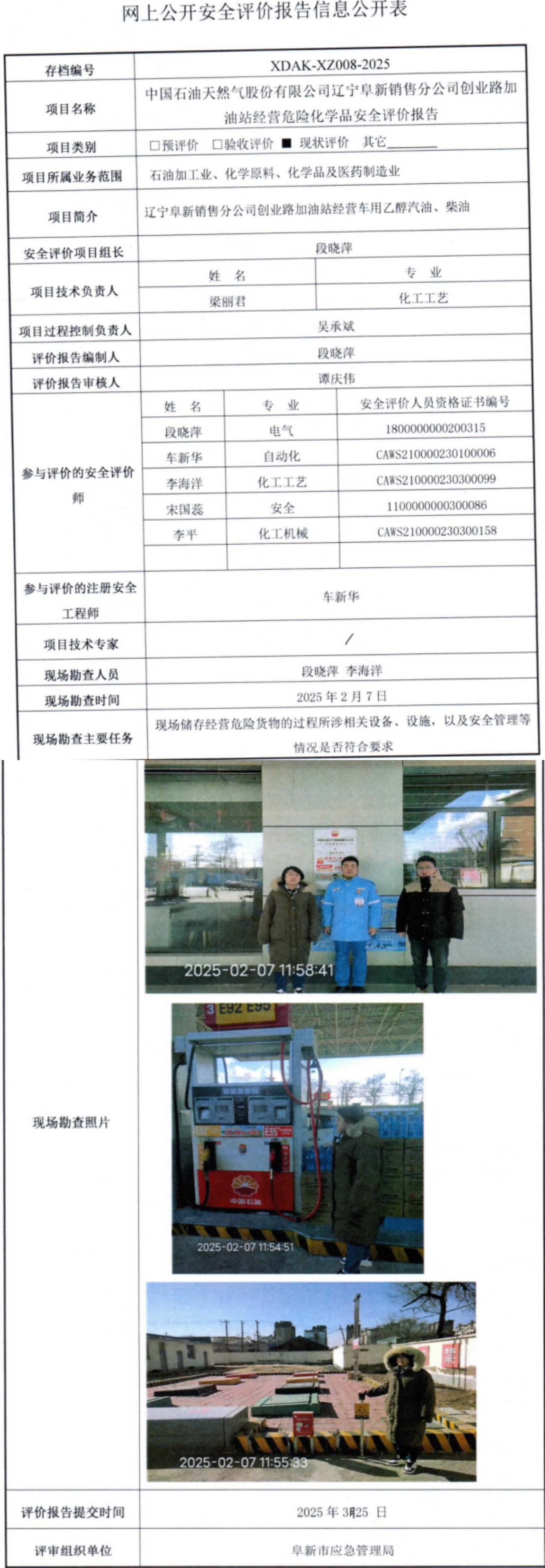 中国石油天然气股份有限公司辽宁阜新销售分公司创业路加油站经营危险化学品安全评价报告