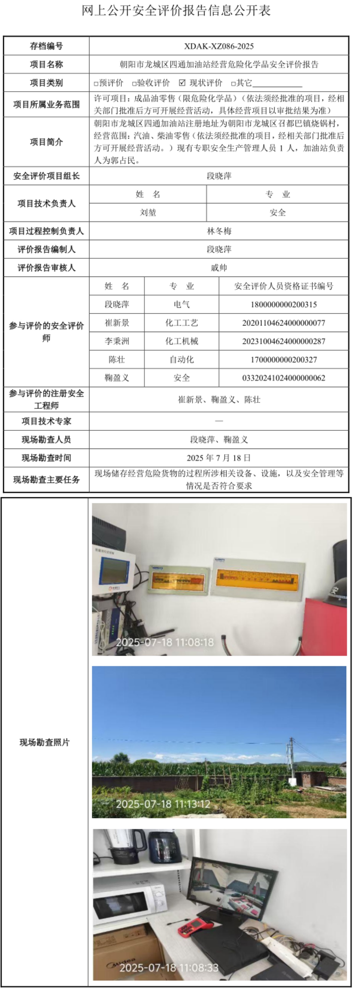 朝阳市龙城区四通加油站经营危险化学品安全评价