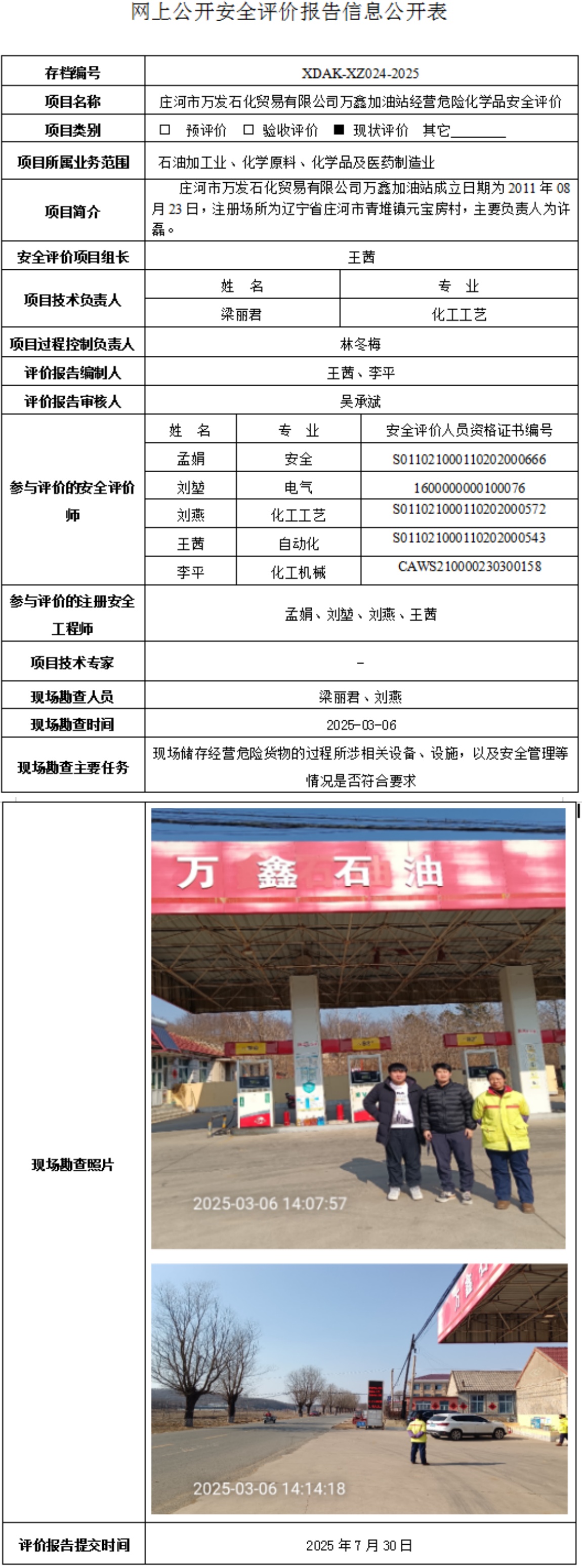 庄河市万发石化贸易有限公司万鑫加油站经营危险化学品安全评价