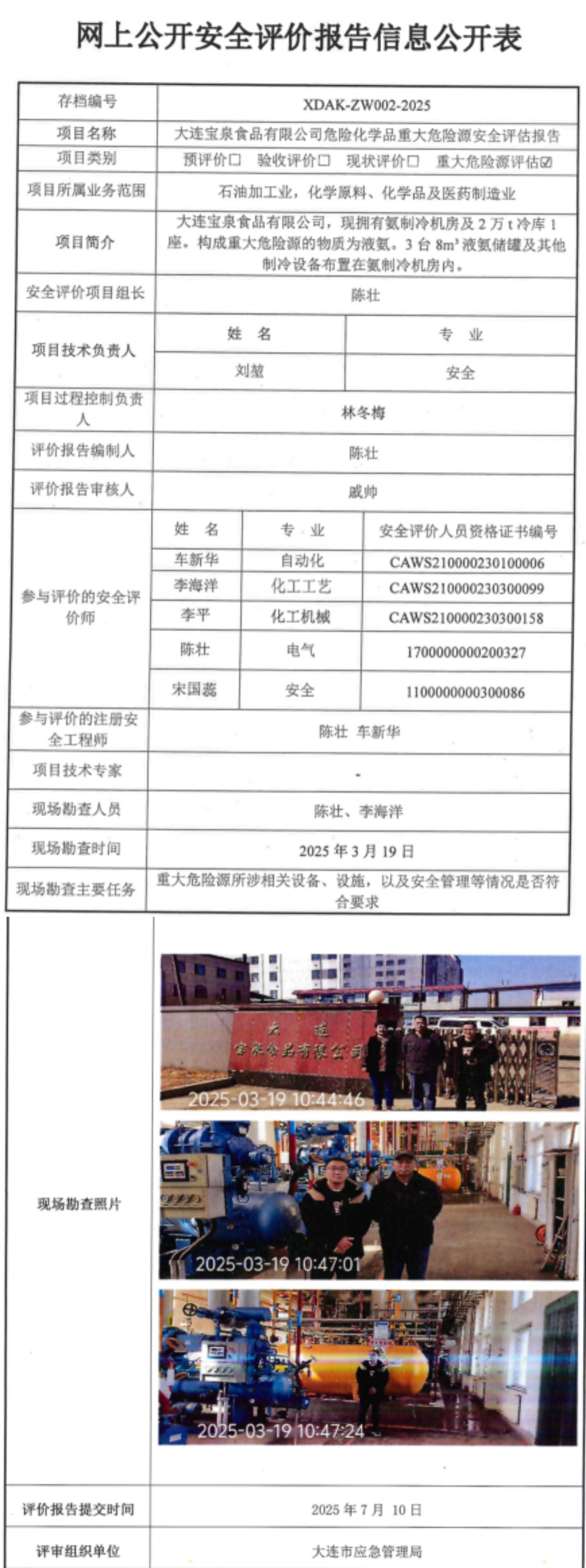 大连宝泉食品有限公司危险化学品重大危险源安全评估报告