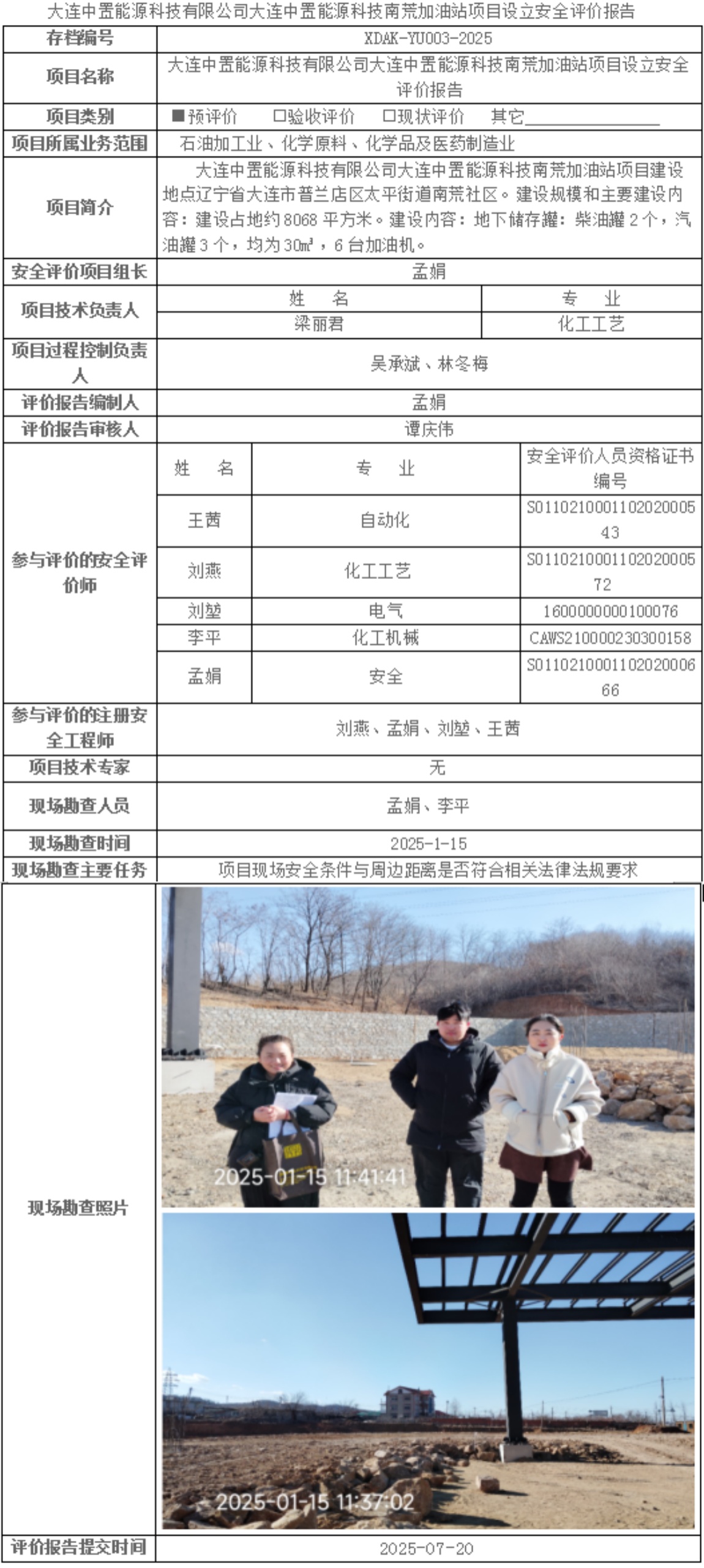 大连中置能源科技有限公司大连中置能源科技南荒加油站项目设立安全评价报告