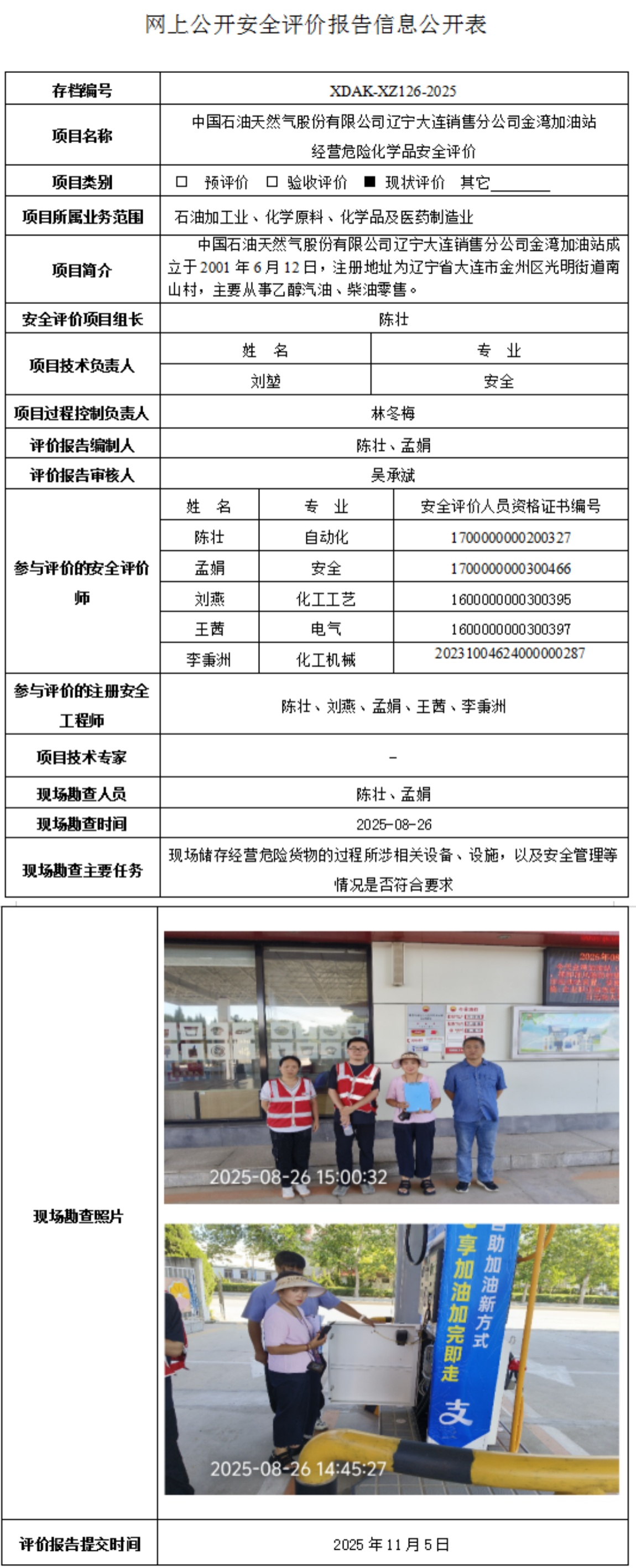 中国石油天然气股份有限公司辽宁大连销售分公司金湾加油站 经营危险化学品安全评价