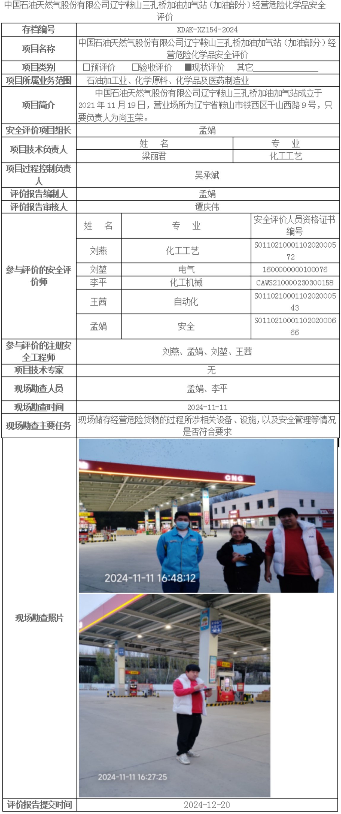 中国石油天然气股份有限公司辽宁鞍山三孔桥加油加气站(加油部分)经营危险化学品安全评价