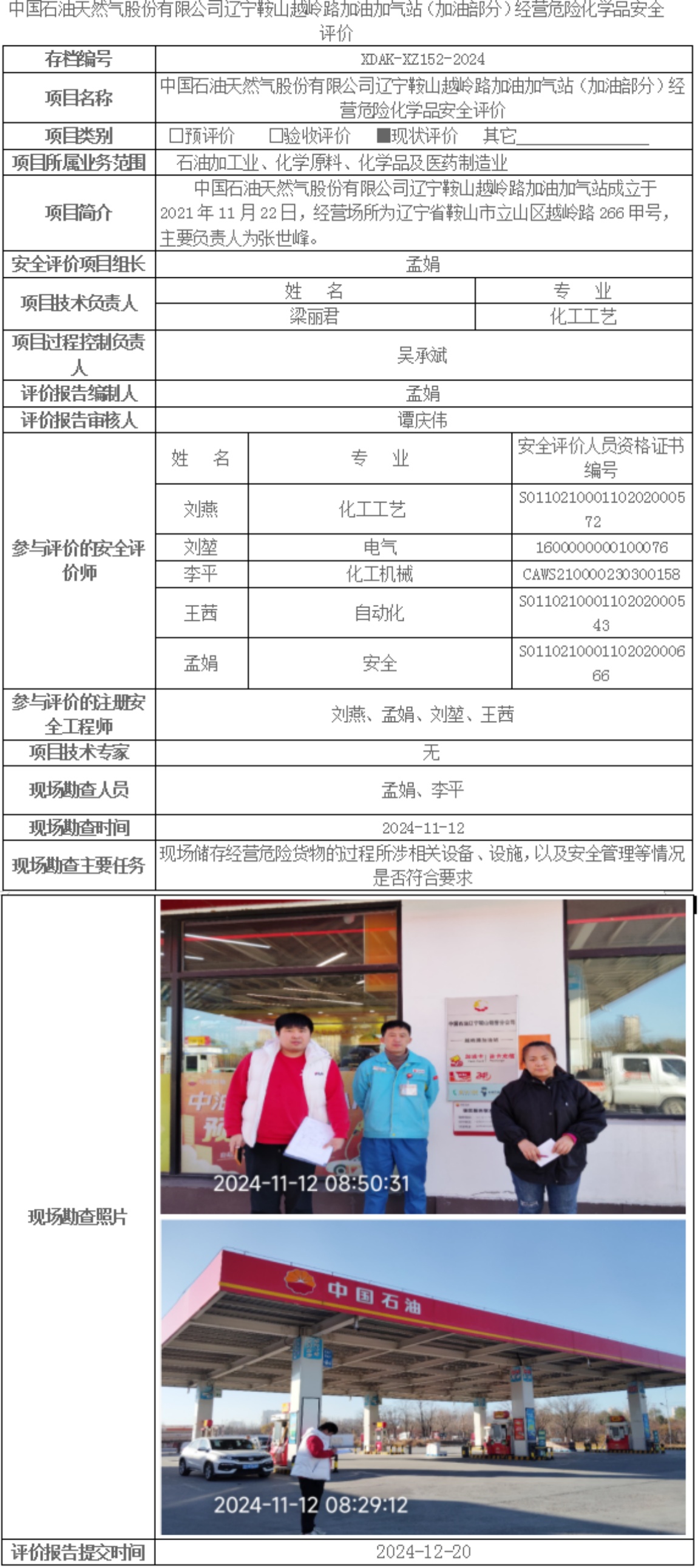 中国石油天然气股份有限公司辽宁鞍山越岭路加油加气站(加油部分)经营危险化学品安全评价