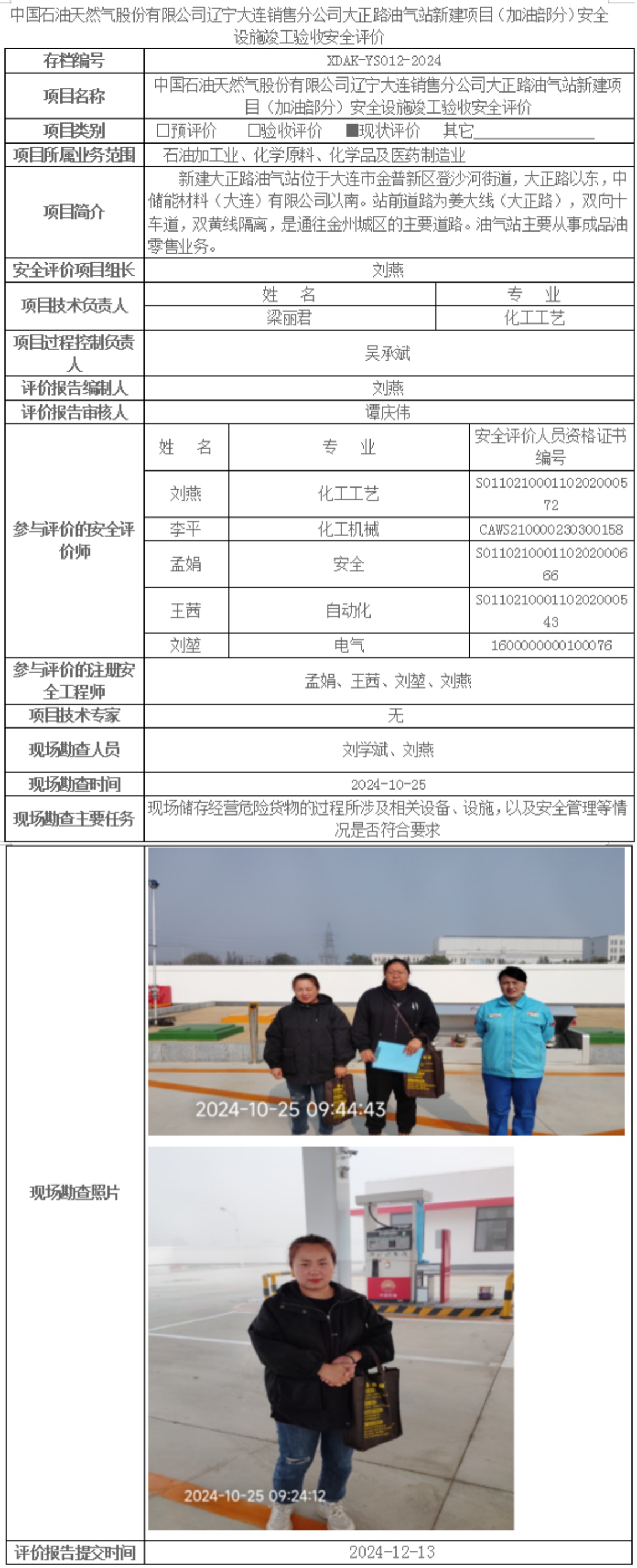 中国石油天然气股份有限公司辽宁大连销售分公司大正路油气站新建项目(加油部分)安全设施竣工验收安全评价