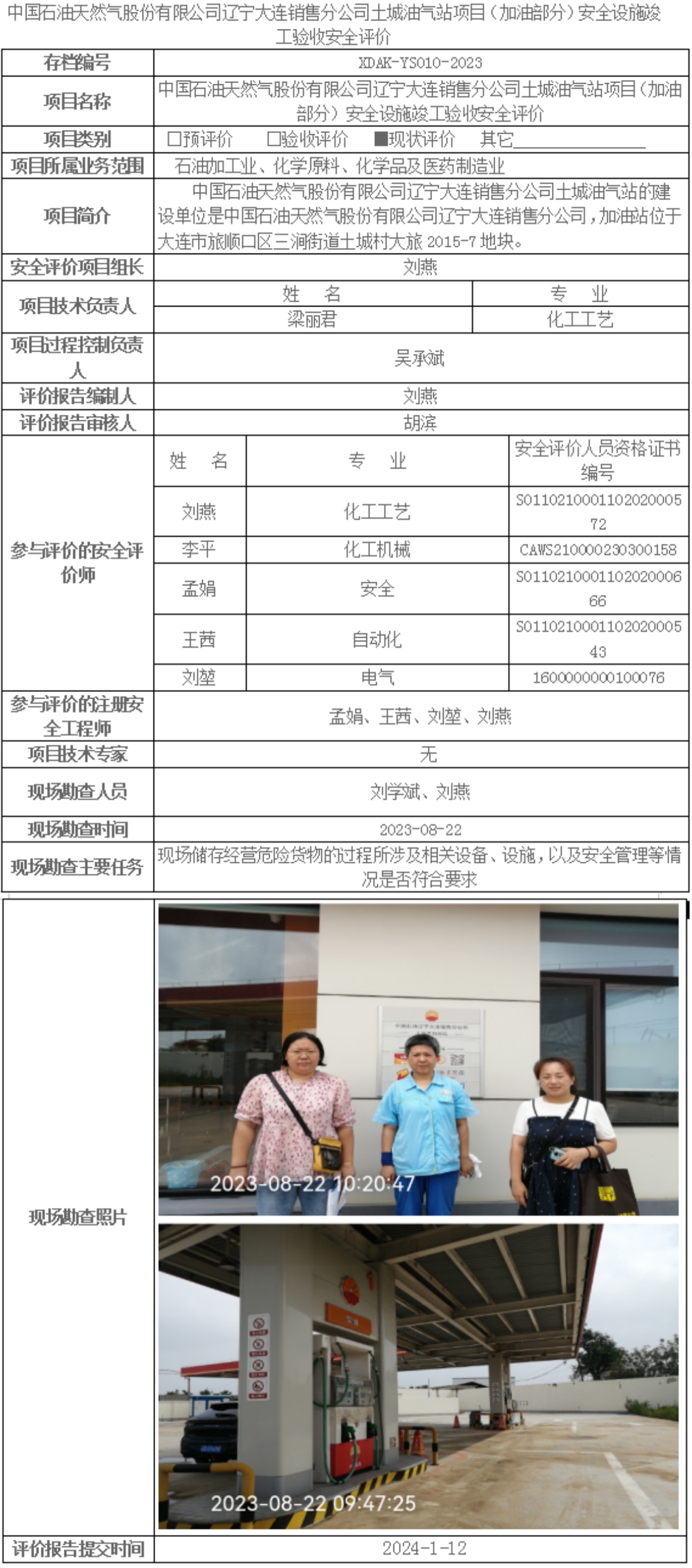 中国石油天然气股份有限公司辽宁大连销售分公司土城油气站项目(加油部分)安全设施竣工验收安全评价