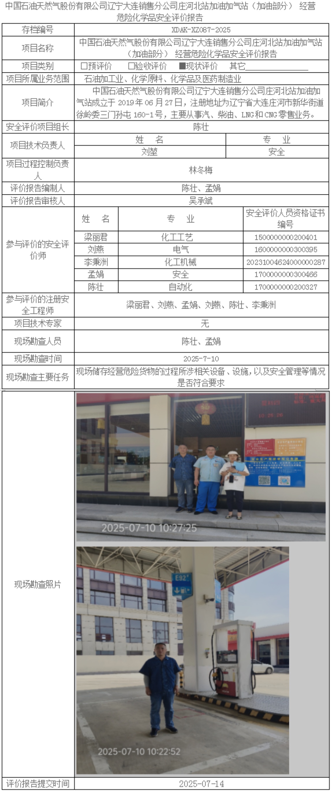 中国石油天然气股份有限公司辽宁大连销售分公司庄河北站加油加气站(加油部分) 经营危险化学品安全评价报告