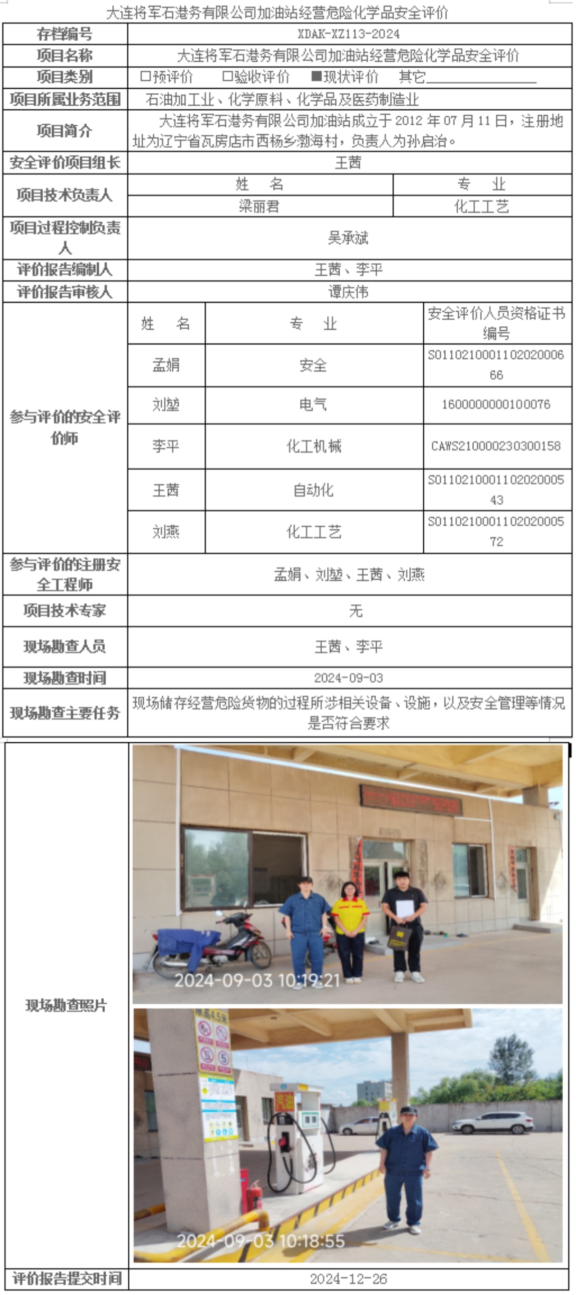 大连将军石港务有限公司加油站经营危险化学品安全评价