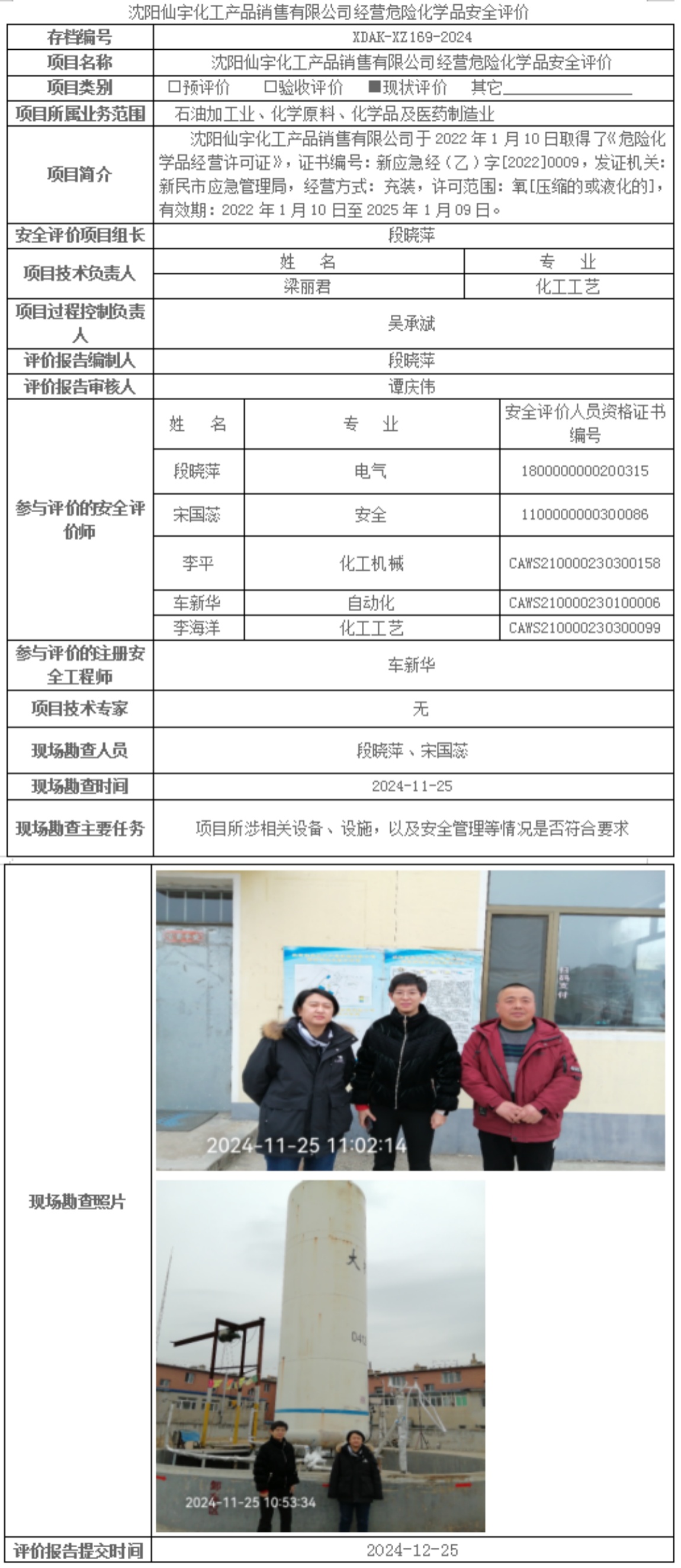 沈阳仙宇化工产品销售有限公司经营危险化学品安全评价