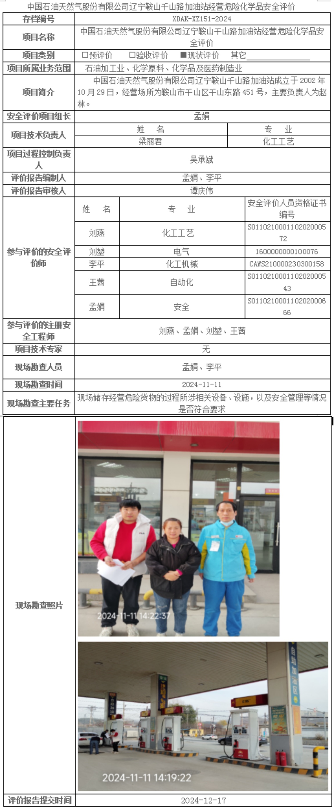 中国石油天然气股份有限公司辽宁鞍山千山路加油站经营危险化学品安全评价