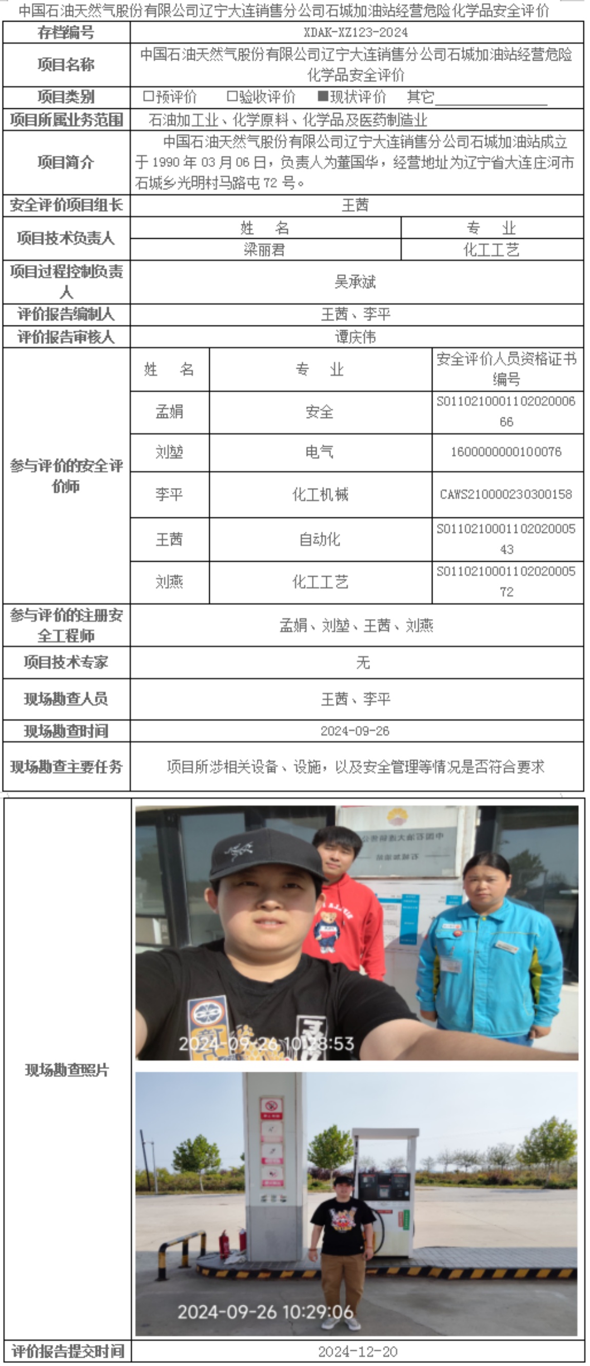 中国石油天然气股份有限公司辽宁大连销售分公司石城加油站经营危险化学品安全评价
